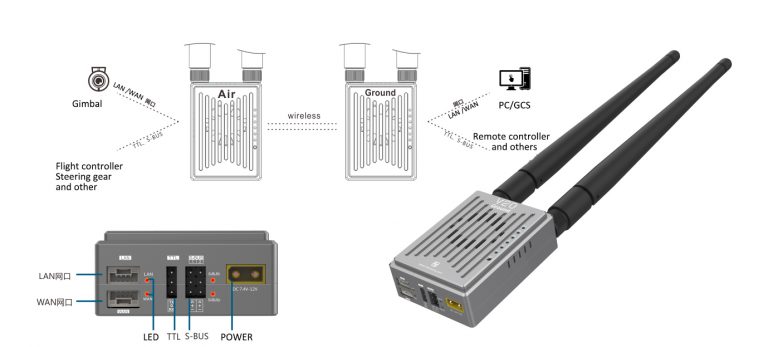 V20 Video link is 2X2 MIMO wireless digital data transmission link With 10/100 Ethernet image transmission, serial gateway function Simultaneous transmission of remote control signals, digital transmission signals, and image transmission signals Small size, easy to integrate, high sensitivity.